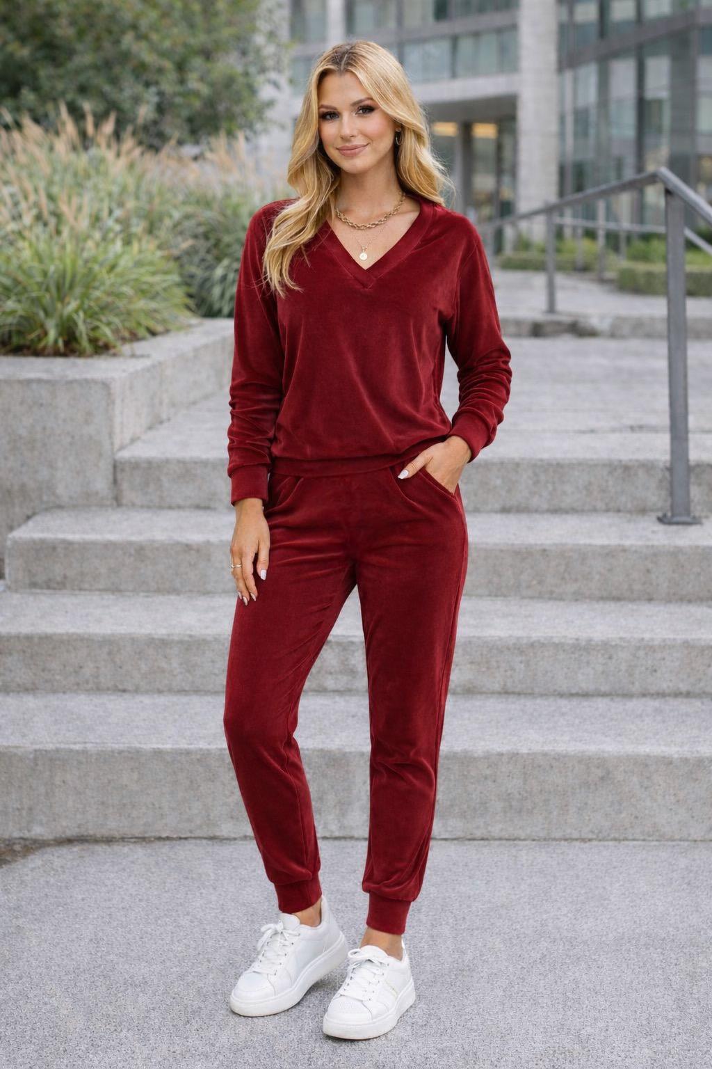 Treningul este realizat din material catifelat moale, plăcut la atingere, ideal pentru ținute confortabile cu un aer elegant. Bluza are croială lejeră, cu decolteu în V și manșete elastice, oferind libertate de mișcare și un look modern.