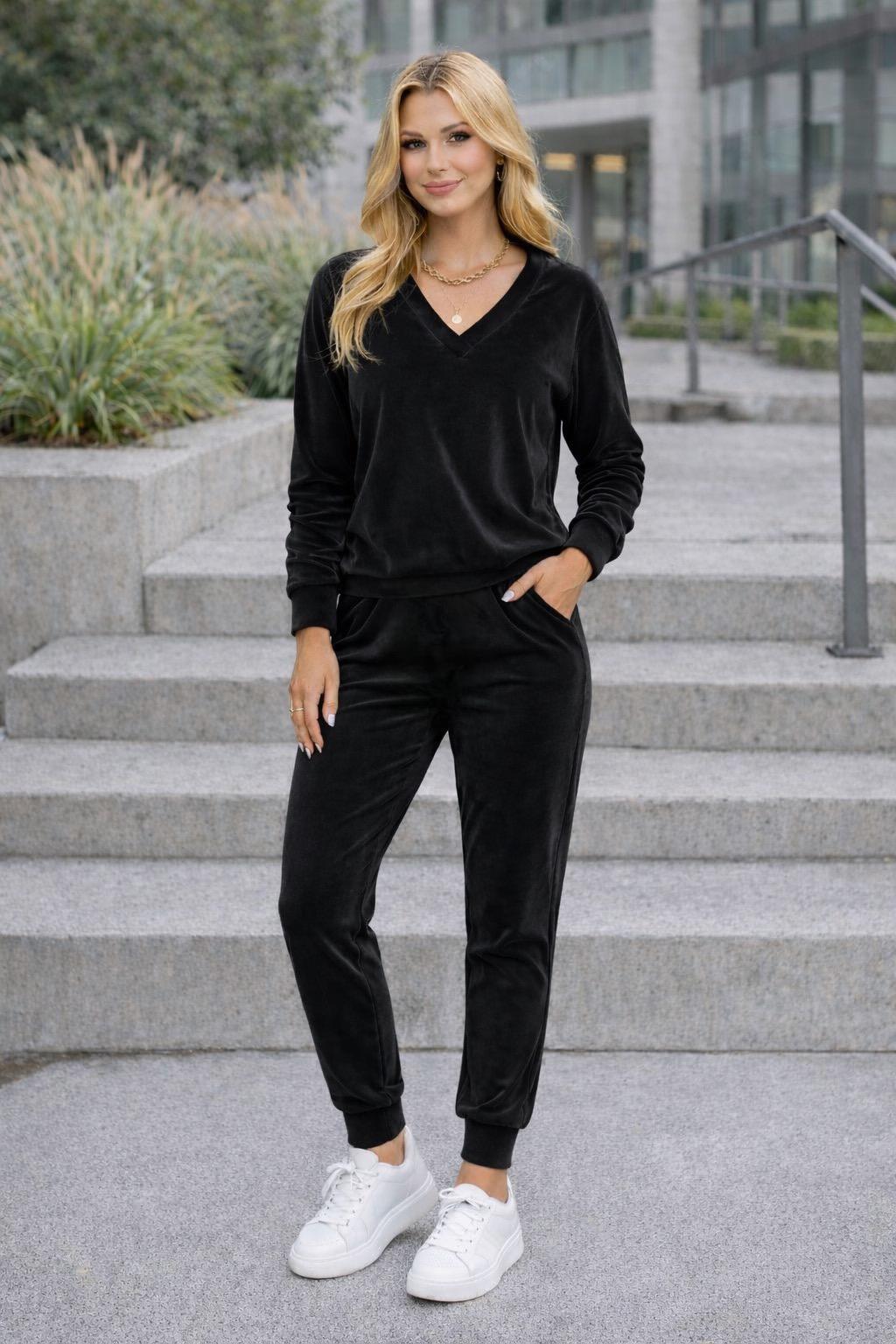 Treningul este realizat din material catifelat moale, plăcut la atingere, ideal pentru ținute confortabile cu un aer elegant. Bluza are croială lejeră, cu decolteu în V și manșete elastice, oferind libertate de mișcare și un look modern.